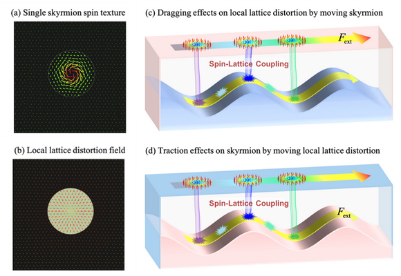 图1:(a)单个磁性斯格明子自旋组态(箭头表示面内自旋分量,由其面外分量进行着色)和(b)局域晶格畸变场(LLDF)示意图(箭头表示原子相对其晶格的偏移);(c)当磁性斯格明子在外场作用下定向运动时,其感受到LLDF提供的阻力;(d)当LLDF在外场作用下定向运动时,磁性斯格明子感受到LLDF提供的牵引力。在(c)和(d),彩色箭头表示顶部的磁斯格明子结构;彩色火花表示LLDF感受到的具有与母体晶体相同晶格周期性的保守势场;而连接磁性斯格明子和LLDF的彩色杆代表了由于自旋晶格耦合效应而产生的相互作用。