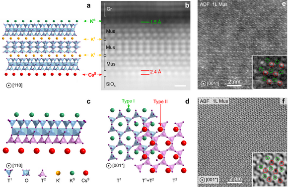 图1. 双层及三层蛭石层间交换离子位置的原子结构示意图及表征。e-f为HAADF STEM像,由于Cs为重原子,图中亮点即单个Cs+。
