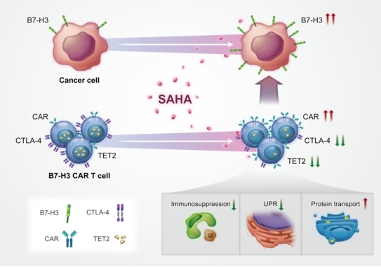 CAR-T细胞治疗在血液系统疾病如白血病已取得很好疗效,然而在实体瘤中效果却很有限。本研究首先基于人体组织芯片发现B7-H3在多种人体实体瘤中高表达而在正常组织表达很低或几乎不表达,进而构建了以B7-H3为靶点的第三代CAR-T。同时通过对表观调控药物的筛选,发现低剂量的组蛋白去乙酰化酶抑制剂Vorinostat (SAHA)与B7-H3.CAR-T细胞具有很强的协同作用;进而通过高通量的测序等发现SAHA可以上调肿瘤细胞B7-H3和CAR-T细胞B7-H3.CAR的表达,并下调CAR-T细胞免疫抑制分子CTLA-4 和TET2表达。最后通过体内外实验证实了B7-H3.CAR-T细胞联合SAHA可明显增强对头颈鳞癌、三阴乳腺癌、非小细胞肺癌和恶性黑色素瘤的杀伤。该研究为提升CAR-T细胞对实体瘤的疗效提供了重要策略。