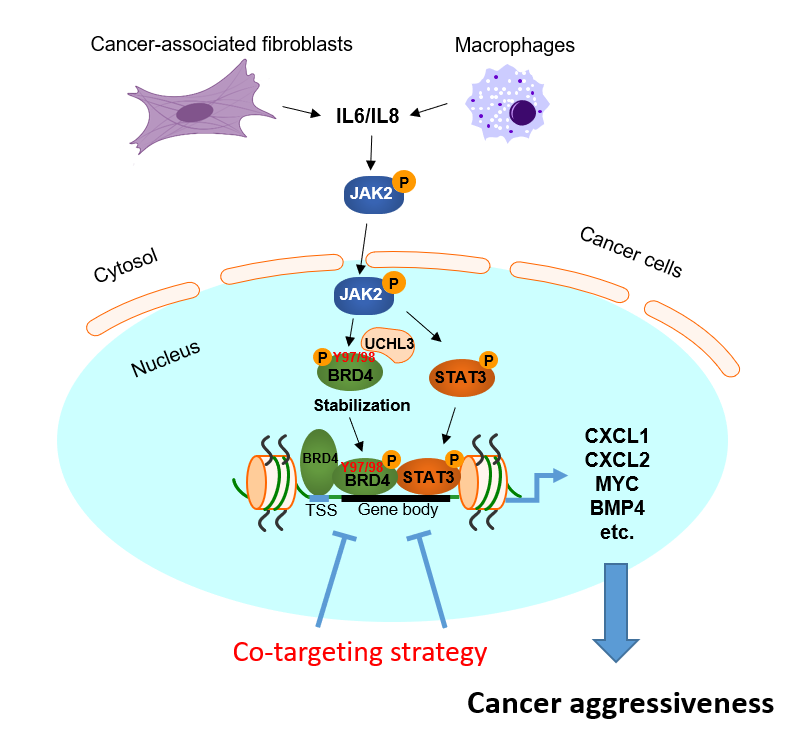 团队人员首先建立了患者来源的肿瘤细胞(patient-derived cancer cells, PDCs)及肿瘤相关成纤维细胞(cancer-associated fibroblasts,CAFs)共培养模型。进一步通过细胞因子、表观遗传因子筛选联合质谱分析等手段,鉴定出CAFs分泌的细胞因子IL-6/IL-8通过激活JAK2激酶通路,磷酸化BRD4,促进其与去泛素化酶UCHL3结合从而增强BRD4蛋白稳定性。此外,第97位酪氨酸(Y 97)是BRD4 与BET 抑制剂-JQ1 结合口袋中的关键残基,BRD4 Y97/98 的磷酸化削弱了 JQ1与BRD4的结合能力,导致 JQ1治疗抗性。更深入的探索发现 BRD4磷酸化还有助于其与 STAT3 的结合,诱导染色体重塑,协同促进原癌基因增强子活性及相关基因的转录。抑制 IL-6/IL-8-JAK2 信号能够消除 BRD4 磷酸化,增加BETi敏感性。