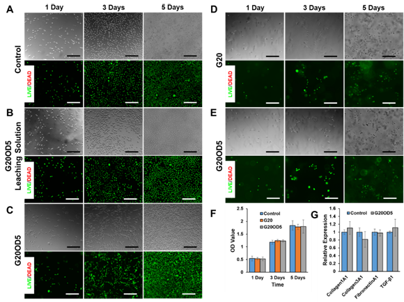 通过平面培养和三维立体培养的体外细胞实验证明,该粘合体系无细胞毒性且不会引起角膜基质纤维细胞的转型,导致额外的角膜基质瘢痕反应(图3)。
