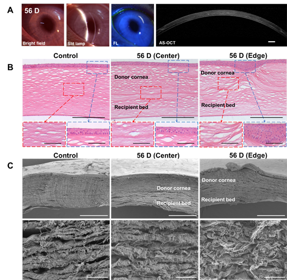 采用该生物粘合剂替代传统缝线固定,角膜植片与角膜植床贴附良好,裂隙灯显微镜和眼前段OCT均显示移植后角膜保持良好光学透明性和表面弧度。H&E染色的显示术后56天角膜上皮层已恢复正常厚度,未观察到炎症细胞。结合电镜显示角膜基质层结构正常,受体与供体整合良好,粘合剂的缓慢降解特性完美匹配于植片-植床愈合规律(图5)。