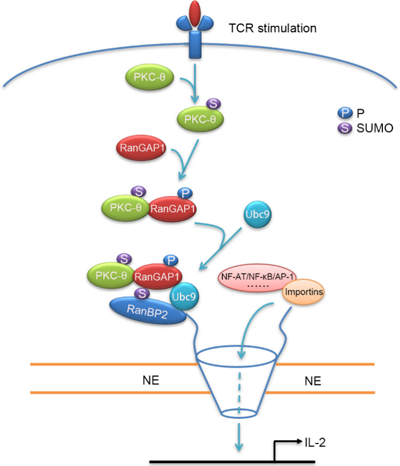 近日,我校生命科学学院李迎秋课题组研究首次揭示,人或鼠T细胞受到TCR信号刺激后,蛋白激酶PKC-θ直接磷酸化蛋白分子RanGAP1,促进RanBP2亚复合物组装及入核转运,从而引起AP-1的核转位。研究发现,TCR信号刺激诱导PKC-θ与NPC发生共定位并磷酸化RanGAP1, 而将RanGAP1上的磷酸化位点突变成非磷酸化位点,则抑制TCR信号诱导的关键转录因子核转位。究其原因,发现PKC-θ磷酸化RanGAP1增强其与SUMO化修饰中的缀合酶Ubc9结合,进而增强其SUMO化修饰,促进RanBP2亚复合物的组装(见示意图)。