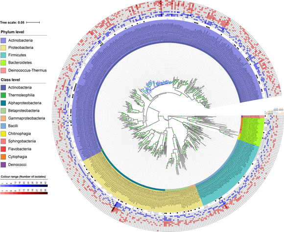 我校生命科学学院李文均教授团队结合免培养测序和纯培养方法研究,探究了不同类型沙漠土壤(非根际土和根际土)中链霉菌的多样性,并采用两种不同选择强度的培养策略(SCP和CCP)对沙漠样品中链霉菌菌株的分离效率进行了评估。结果显示,相比于免培养,纯培养方法对于探索沙漠环境中链霉菌的多样性是必要的,丰富了我们对于沙漠链霉菌生物地理分布的认识。研究也发现,更具选择性的链霉菌分离培养策略(Streptomycetes Culture Procedure,SCP)是一种高效获取沙漠链霉菌资源的方案(图1)。值得一提的是,作者也在研究中成功分离到1589个沙漠来源细菌菌株,以及469个沙漠链霉菌新菌株,其中包括大量潜在的细菌新分类单元(图2),这些极端生境来源的新菌株资源为进一步开展微生物天然产物和新生物合成途径的多组学挖掘提供了强有力支撑,进一步充实了我国战略微生物种质资源库。该研究也为沙漠环境链霉菌的多样性调查及分离培养提供了思路和参考。