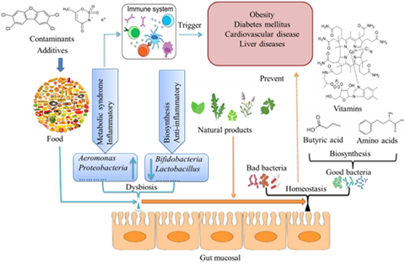 肠道菌群可以为人体提供营养,调节新陈代谢和免疫,合成人体生长发育所需的氨基酸和维生素等,在人类健康和疾病中起着非常重要的作用。在正常情况下,肠道中各种微生物处于一种和平共处的状态;当肠道菌群发生紊乱时,将引起多种慢性疾病,如肠炎、肥胖、糖尿病、心血管疾病、肝病和癌症。随食物和水进入人体的环境污染物和某些食品添加剂可以引起肠道菌群紊乱,进而引发某些疾病,而膳食活性成分可以将紊乱的肠道菌群恢复到稳态,对某些疾病起到预防和治疗作用。