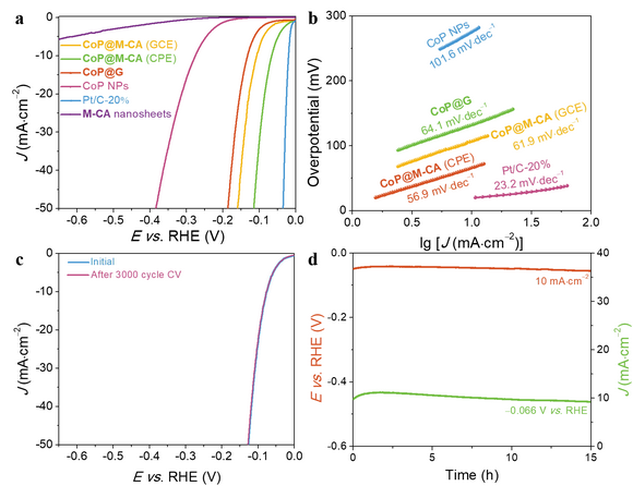 图3. (a) 不同材料的HER极化曲线及其对应的 (b) Tafel斜率对比;(c) 3000次循环伏安扫描前后的极化曲线对比;(d) CoP@M-CA计时电位曲线和计时电流曲线。