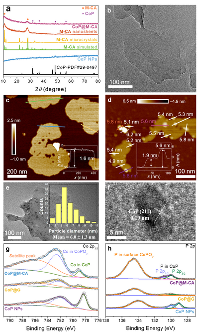 图2. (a) 不同材料的PXRD谱图;(b) M-CA纳米片的TEM图;(c) M-CA纳米片的AFM图;(d) CoP@M-CA的AFM图;(e) CoP@M-CA的TEM图;(f) 在CoP@M-CA中典型CoP纳米颗粒的HRTEM图;(g,h) 不同材料的XPS光谱。