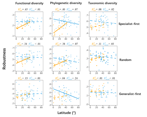 图3 不同多样性类型和初始灭绝情形下,稳健性与纬度在大陆(蓝色)和岛屿(橙色)的关系。其中实线代表显著关系(P<0 .05)。