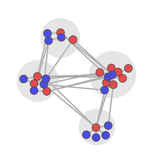 图1 传粉网络模块性示意图。红蓝圆点分别代表传粉动物和开花植物,灰色线条代表存在传粉互作,灰色圆圈代表不同的模块。