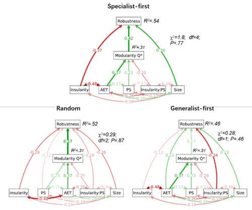 研究基于数据库web of life, interaction web database以及文献查找获得了全球79个传粉网络(图2),并搜集了网络中传粉者的功能群和谱系关系信息。通过模拟共同灭绝的方法,衡量了网络中传粉者的物种、功能群和谱系多样性的稳健性,进而分析了稳健性与网络模块性、纬度、岛屿性和气候的关系。研究结果显示,在专性植物先灭绝的情境下,传粉者谱系多样性的稳健性在大陆上随纬度升高而减弱,但在岛屿上随纬度升高而增强(图3)。形成该稳健性的地理格局的机制是,实际蒸散量和降水季节性通过网络模块性间接地影响了稳健性,而且降水季节性在大陆上促进模块性,但在岛屿上却会降低模块性,由此解释了稳健性在大陆和岛屿环境下相反的纬度梯度(图4)。