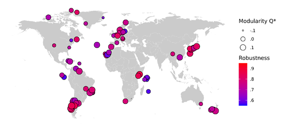 该研究结果表明,环境因素通过网络模块性对稳健性产生的间接影响是普遍存在的,验证了提出的假说。由于这种间接影响,在专性植物易灭绝的情况下,传粉者谱系多样性在热带岛屿和寒带大陆相较于其他区域更为脆弱。这对我们了解生态系统脆弱性和实践全球的生物多样性保护,具有重要的指导意义。