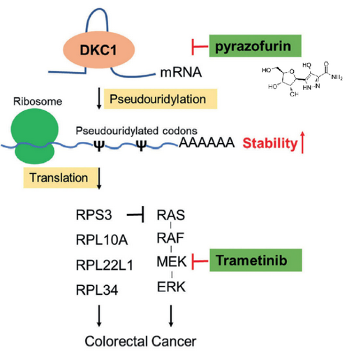 DKC1属于假尿嘧啶合成酶家族,催化RNA发生假尿嘧啶(ψ)修饰。DKC1同时也是端粒酶复合物的亚基,其基因突变会导致先天性角化不良,但其在肿瘤治疗中的潜在价值目前尚未知晓。研究团队发现DKC1的表达水平在结直肠癌组织中异常升高,且其高表达与患者的不良预后显著相关。功能研究表明,DKC1能够结合包括RPS3在内的多个核糖体蛋白的mRNA,延长这些mRNA的半衰期,从而升高RPS3等蛋白在细胞内的表达量,促进肿瘤细胞的恶性增殖。相反,DKC1的抑制剂pyrazofurin则显著抑制RPS3等核糖体蛋白的表达,具有抗肿瘤活性。这些研究表明DKC1是一个结直肠癌治疗的候选新靶标。