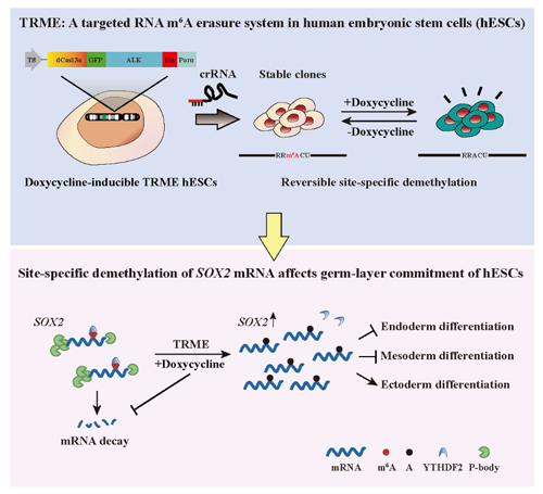 N6-甲基腺嘌呤(N6-methyladenosine, m6A)作为真核生物mRNA上含量最丰富的化学修饰之一,几乎参与了所有转录后调控过程,包括RNA的剪接、加工、转运、降解及翻译等。相关领域的前期研究表明:在胚胎干细胞(Embryonic Stem Cells,ESCs)中m6A甲基转移酶METTL3敲除后,会引起全转录组范围甲基化水平下调并导致ESCs分化障碍,从而提示m6A修饰在早期胚胎发育中发挥着十分重要的作用。由于在ESCs中缺乏对单个m6A修饰进行精确调控的工具,METTL3敲除导致的ESCs分化缺陷是由单一位点RNA甲基化事件引起的,还是由多个m6A修饰位点协同作用引起的?单个m6A位点修饰的改变是否足以决定细胞命运?这些科学问题仍未被阐明。