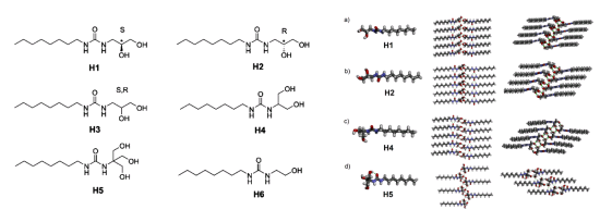 近日,我校化学学院博士生黄礼博在Lehn功能材料研究所超分子化学与材料方向外籍导师Mihail Barboiu教授的指导下,设计了一类高效新颖的亲水性羟基人工水通道,可通过控制样品浓度的方式,实现自适应传输水分子或水簇,同时排除几乎所有离子甚至质子。其结构如图2所示,在该类分子中,辛基作为分子的“尾巴”,可以使分子有效地嵌入细胞膜中;脲基作为结构的“骨架”,脲基之间连续且有序的氢键作用使分子呈一维紧密排列,兼顾水通道的稳定性;含多羟基的衍生基团作为分子的“头部”,与水分子直接接触,具有传输水分子且控制通道尺寸排除离子的作用。