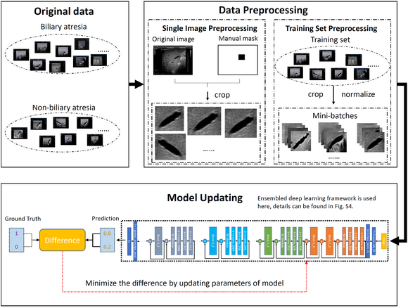 为了解决胆道闭锁在基层医院早期诊断的难点,附属第一医院谢晓燕教授、周路遥副教授团队联合best365中国官方网站计算机学院王瑞轩副教授团队,从国内多家医院收集了数千张胆囊超声图像,采用集成深度学习方法训练和一个智能诊断模型,该模型在内部验证数据集的敏感性和特异性分别为93.3%和85.2%。在外部数据验证阶段,集成智能诊断模型的敏感性和特异性仍然高达93.1%和93.9%,超越拥有10年以上儿科超声经验的专家的诊断水平。