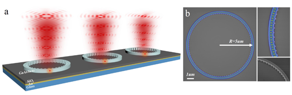 图. 嵌入量子点的微环谐振腔产生携带OAM量子叠加态的单光子源示意图及样品实物图