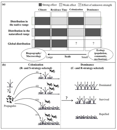 CSR策略是英国著名生态学家Philip Grime提出的竞争Competitor (C)、胁迫Stress tolerator (S)和传播环境Ruderal (R)功能策略体系,植物这3方面能力分别对不同情境下植物的分布范围扩张具有促进作用,但是CSR策略如何影响植物在全球的分布空间范围尚不明确。我校生命科学学院彭少麟教授团队最新科研成果“The role of functional strategies in global plant distribution”创新性地回答了植物分布扩张领域中的这一关键科学问题(图1a),并首次直接比较了植物在原产地和引入地分布范围扩张的功能策略差异(图1b)。