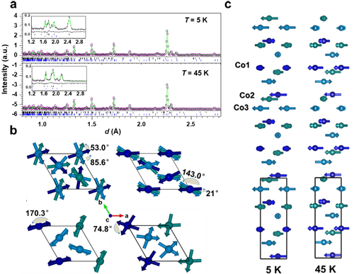 图2. 变温粉末中子衍射测定HP-CTO在5和45 K下的磁结构