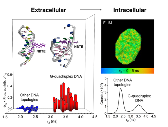 众所周知,DNA是储存和传递遗传信息的场所,是许多疾病的主要药物靶点。其中富含鸟嘌呤的寡核苷酸可以自组装形成两层或多层的的G-四链体结构。G-四链体DNA可以在特定的细胞环境和细胞周期自组装形成以执行特定的生物学过程,包括DNA复制、基因表达、基因组稳定性和端粒生物学等。为了进一步阐明G-四链体DNA的结构-功能关系及其在癌症诊断和治疗中的潜在应用,迫切需要发展对体内G-四链体DNA的可视和定量探测方法。然而由于G-四链体DNA具有结构多态性等因素,实时定量检测体内G-四链体DNA结构仍然具有挑战性。