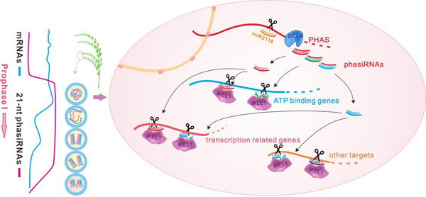 植物配子体发育直接影响着作物的产量。减数分裂是雄配子体形成早期最关键的步骤之一。在减数分裂前期,有一批蛋白编码基因的表达会迅速改变,然而它们如何被调控还是未知的。有趣的是,在水稻等作物中,有一类特殊的小分子非编码RNA phasiRNA在减数分裂前期短暂且大量地表达,但它们存在的意义还不清楚。