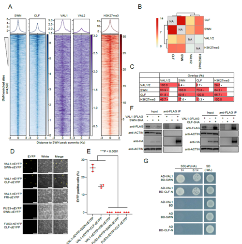 图1:VAL1/2直接与PRC2复合体催化亚基SWN/CLF互作, 且结合到大量的PRC2复合体的靶基因上。