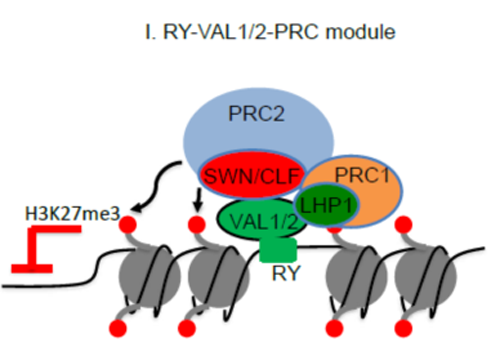图2:VAL1/2招募PRC2复合体的工作模型。VAL1/2能直接与PRC2复合体催化亚基SWN和CLF互作,并招募它们到靶基因上进行H3K27me3催化,抑制靶基因的转录。