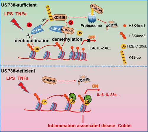 综上所述,该工作揭示了USP38-KDM5B蛋白质复合物在炎症应答过程中通过连锁抑制组蛋白泛素化与甲基化的水平,选择性抑制炎症因子的表达,从而负向调控炎症发展进程的新分子机制。