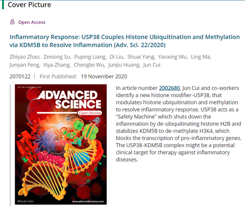 生命科学学院崔隽教授团队在Advanced Science上发表封面文章揭示USP38通过调控组蛋白泛素化/甲基化连锁反应抑制炎症的新机制
