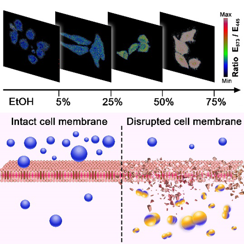 实验表明,Pt1的细胞摄取量与细胞膜完整性呈线性关系。利用不同浓度的乙醇孵育,我们构建了细胞膜受损的生物模型。在乙醇或非乙醇处理的细胞中,Pt1的蓝色发光强度均保持不变;而在细胞膜受损模型中,黄色发射强度呈乙醇浓度依赖性,因此黄色发射与蓝色发射的比值可以反映细胞膜的损伤程度。