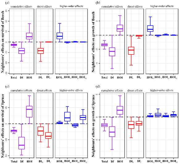 该研究首次明确指出个体水平高阶相互作用 (Individual-level HOIs),既能统一狭义高阶相互作用 (Hard-HOIs) 与广义高阶相互作用 (Soft-HOIs) 在定义上的分歧,又能在计算直接和高阶相互作用时明确考虑个体信息 (个体大小和空间位置等);并提出了量化个体水平高阶相互作用的新方法。在此基础上,对捷克一个25公顷的温带森林样地 (Zofin) 中两个优势物种欧洲水青冈 (Fagus sylvatica) 和欧洲云杉 (Picea abies) 个体水平高阶相互作用进行了检验。发现包含高阶相互作用的模型可以显著提高对欧洲水青冈和欧洲云杉存活与生长的预测。在该样地中,邻体对目标个体的直接影响均不利于目标个体的存活和生长,但是正的高阶相互作用弱化了这种直接竞争强度 (图2)。因此,以往研究因忽略邻体高阶相互作用很可能低估了邻体对目标个体的直接作用强度。该研究首次提供了森林群落中树木间高阶相互作用的证据,并为广泛检验高阶相互作用在自然群落中的普遍性和重要性,探索高阶相互作用的纬度格局,揭示高阶相互作用的发生机制及其对生物多样性维持的影响提供了重要的基础。