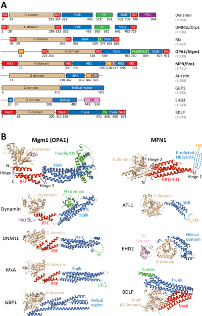 图1:dynamin家族成员的结构。(A)结构域分布示意图。(B)晶体结构对比。