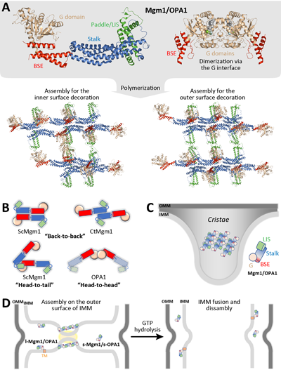 图3:OPA1/Mgm1介导线粒体外膜融合的机制。(A)OPA1/Mgm1的结构。(B)Mgm1的聚合方式。(C)嵴塑形的机制。(D)线粒体内膜融合过程示意图。
