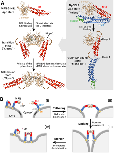 图2:MFN介导线粒体外膜融合的机制。(A)MFN1/2的结构及其与BDLP的对比。(B)线粒体外膜融合过程示意图。