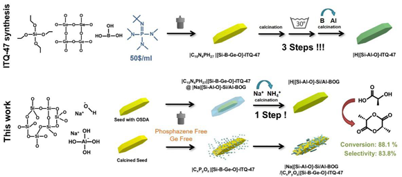 图1 两种制备具有强酸性中心的硅铝BOG分子筛的路径的比较:ITQ-47的合成后处理和晶种导向Si/Al功能化