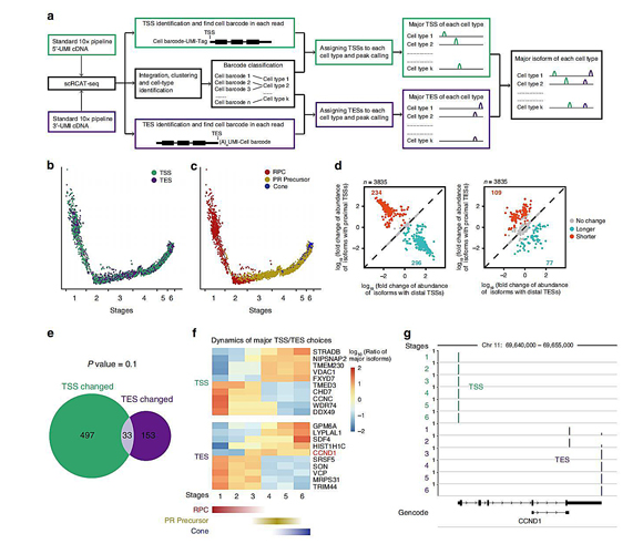 以人胚胎干细胞来源的视网膜类器官为研究对象,通过对10571个单细胞进行测序分析,该研究描绘了视网膜祖细胞(RPC)向光感受器前体细胞(PR precursors),进一步向视锥细胞(cone)分化的转录异构体的表达图谱,发现转录异构体变化最显著的时间点发生在RPC向光感受器前体细胞转变的节点。该研究还发现CCND1异构体可能通过调节细胞周期,介导RPC向光感受器前体细胞的命运转换(图4)。