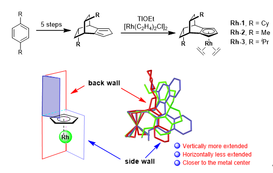 手性[2.2.2]桥环Cp配体最早由Halterman和Vollhardt于1987年报道,但遗憾的是,该类Cp配体一直都没有引起人们的关注,其在不对称催化反应中的应用也基本是一片空白。近日,汪君课题组通过参考并优化Halterman的合成方法,从1,4二烷基取代苯出发,经过5步合成了三种光学纯的手性Cp配体,并成功制备了相应的手性CpRh(I) 络合物 (图2)。其中,环己基取代的络合物 Rh-1的结构通过单晶X-射线衍射得到确认。有趣的是,当与手性联萘CpRh和螺环CpRh络合物的单晶结构进行对比时,发现桥环CpRh的 “side wall”——环己基在竖直方向更加伸展,而在水平方向较为紧凑。另外,单晶数据还表明该催化剂的“side wall”更靠近中心金属。催化剂的这些结构特点预示着其可能具有独特的催化性能。