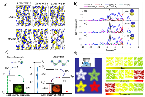 单晶 X-射线衍射分析和理论计算表明,引起上述三种不同配位聚合物多色可调长余辉的主要原因在于,卤素影响下的单分子状态和分子堆积状态的三线态能级发光共存。同时,卤素重原子效应对促进系间窜越和缩短磷光寿命产生相互抗衡的两种作用,从而对长余辉的效率和寿命带来影响并随外界参量产生调变。上述结果对于金属-有机长余辉材料的发光机制及其在显示、防伪、成像等领域的应用都具有重要意义(图3)。