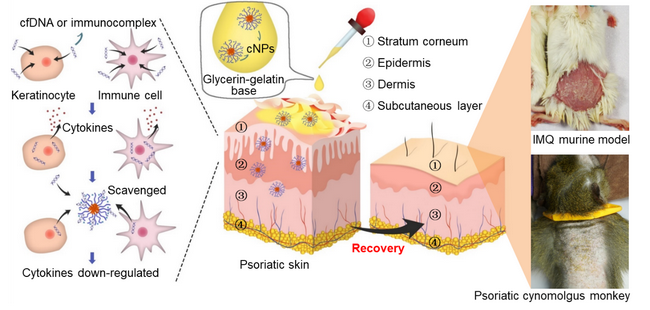尽管银屑病的发病机理很复杂,近年有报道指出游离核酸(cfDNA)在银屑病进程中发挥着关键的作用,临床数据显示在银屑病重症病人的血浆中cfDNA含量明显上升,而进一步的研究也表明在破损皮肤中大量存在的抗菌肽LL37可与银屑病病人自身DNA形成免疫复合物打破免疫耐受,引起非正常免疫反应。因此,陈永明教授和刘利新副教授团队创新性地将阳离子聚合物纳米颗粒(cNP)涂抹到银屑病皮肤上进行局部治疗,利用cNP与cfDNA的高结合力来破坏DNA-LL37免疫复合物,抑制核酸复合物引起浆细胞样树突状细胞和原代表皮细胞的激活,达到了减缓银屑病模型中红斑、鳞屑、硬化等症状。值得一提的是cNP在银屑病样食蟹猴中仍然发挥出有效的治疗效果,且cNP在皮肤各层有较多的积累,却没有过多进入系统循环去各个脏器,因此没有产生明显的系统毒性,具有很好的临床转化前景。
