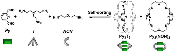近日,我校化学学院Lehn功能材料研究所与法国斯特拉斯堡大学超分子科学与工程研究所合作,基于亚胺类动态共价反应以及课题组对于组分动态网络方面的前期研究基础,对有机笼状与环状化合物自分类组分动态网络的设计和动态适应性进行了深入研究。该研究首先以两种多胺(T、NON)和二醛(Py)构成的三元混合体系为原料,考察其自分类性能。理论上,各组分基元可以在体系中进行随机的结合,产生由单一或混合组分基元所构成的多元复杂体系。因此,在最简单三元组分基元体系中(Py、T、NON),可能产生三种平衡态:1)Py与T或NON选择性结合,产生Py3T2和Py2(NON)2的同质自分类(homo-self-sorting)结构;2)Py与T和NON同时结合,产生一种特定的异质自分类(hetero-self-sorting)结构;3)Py与T,NON的反应不具备选择性,进而产生具有统计学分布的超复杂混合状态。而实验结果表明,该混合体系首先产生一系列的复杂中间体,随后这些中间体有序的转化为热力学稳定状态,生成有机笼状化合物和大环的同质自分类产物,即平衡态1),如图2所示。
