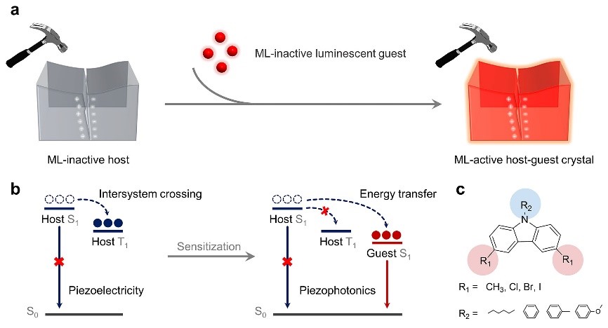 近日,best365中国官方网站化学学院池振国教授研究团队提出利用一种更加简单的方法来精准设计力致发光复合材料体系的新设计策略。该策略设计的力致发光复合材料体系中,单独的主体材料和客体材料都不具有力致发光性能,但是通过主客体复合得到的复合体系则具有力致发光性能,实现了从无到有的力致发光。同时,客体材料的选择范围非常广,可以是纯有机发光材料、配合物磷光材料,也可以是无机量子点发光材料等等。通过改变客体材料的种类,非常容易调节力致发光的发光颜色、亮度、色纯度以及发光寿命等性能,极大地丰富了力致发光材料的研究内涵。结合光物理测试和理论计算,深入探究这类新型力致发光复合体系的激发过程和发射过程,并揭示了复合体系力致发光的激活机制是源于压电效应和主客体分子的能量转移。