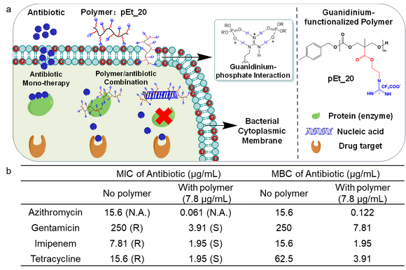 近日,best365中国官方网站药学院(深圳)丁鑫副教授及其合作的研究团队报道了一种可显著增强抗生素抗菌活性并逆转多重耐药性革兰氏阴性菌的耐药表型的大分子化合物。该大分子化合物是由胍基官能团修饰的聚碳酸酯(pEt_20),具有优异的生物安全性和广谱杀菌功能(Nature Communications 2018, 9, 917)。在前期研究工作的基础上,团队进一步发现此类大分子能够在不破坏细菌细胞膜的情况下与胞内的蛋白质和核酸结合,于是提出将其与抗生素联用,以克服细菌的抗生素耐药性。研究发现pEt_20能够使得多种不同类型的抗生素(包括阿奇霉素、庆大霉素、亚胺培南、四环素、多粘菌素等)对多重耐药性革兰氏阴性菌(鲍曼不动杆菌)的最低抑菌浓度(MIC)从耐药范围降到敏感范围,表明pEt_20能够逆转细菌对多种不同类型抗生素的耐药表型。