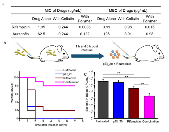 pEt_20不仅能够提高传统针对革兰氏阴性菌的抗生素对耐药菌的抗菌活性,而且还能够极大程度地提高抗肺结核药物利福平和抗风湿类药物金诺芬这两种原本并不用于治疗革兰氏阴性菌感染的药物的抗菌功能。研究表明在与pEt_20联用后,这两种药物的MIC均降低了511倍。更为重要的是,pEt_20能够逆转鲍曼不动杆菌对利福平的耐药性,降低利福平对其耐药菌的MIC和MBC(最低杀菌浓度)分别高达2.5×105倍和4095倍。研究团队进一步利用多重耐药性鲍曼不动杆菌引起的小鼠血液感染模型证明了这种联合疗法的有效性,极大程度地提高了感染小鼠的生存率并降低了血液内的细菌浓度。而且体内实验也表明该药物组合在有效杀菌浓度的剂量下并不会产生系统毒性。此项研究为多重耐药性革兰氏阴性菌感染提供了新的治疗思路。