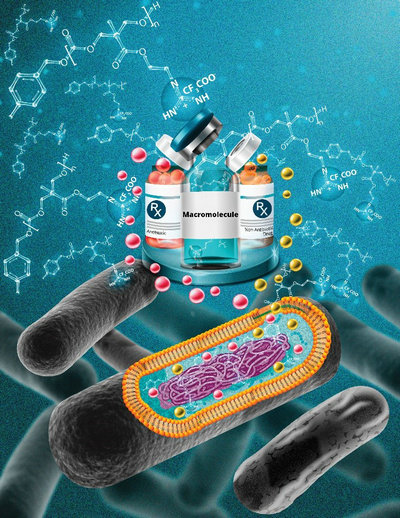 图1. 胍基修饰的大分子化合物增敏抗生素和非抗生素类药物并逆转多重耐药菌耐药表型的示意图