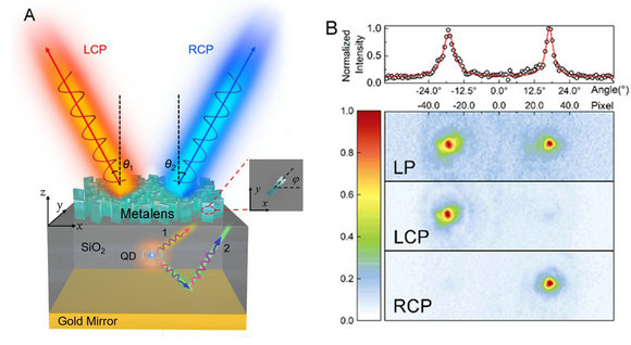 图A:超构表面结构调控量子点辐射示意图。 图B:实验测量远场辐射图。