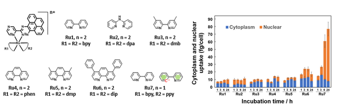 图2. 钌(II)配合物细胞摄取及细胞核靶向性