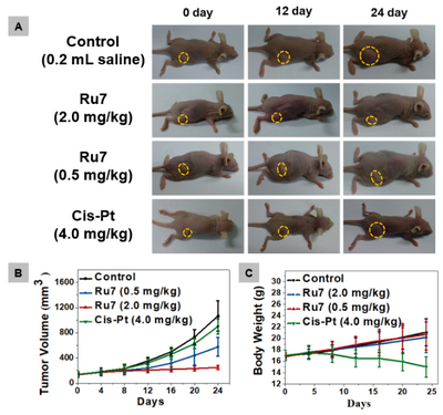 抗肿瘤实验表明Ru7能诱导肿瘤细胞发生坏死性凋亡。细胞信号通路研究证实Ru7通过抑制Topo I/II活性、诱导DNA损伤、激活DNA修复酶PARP-1及下游RIPK1-RIPK3-MLKL坏死性凋亡核心通路,从而有效地克服肿瘤耐药(图3)。该研究首次揭示了钌(II)配合物通过抑制拓扑异构酶,诱导肿瘤细胞坏死性凋亡之间的内在联系。作者进一步开展了小鼠耐药肿瘤模型测试,评估诱导肿瘤细胞坏死性凋亡的金属配合物活体抗肿瘤效果。实验结果表明,经过4天1次腹腔注射给药,连续24天治疗后,Ru7在裸鼠耐药肿瘤模型中表现出非常优异的抗肿瘤活性;荷瘤鼠主要组织器官的切片染色观察表明Ru7并没有造成明显的组织损伤或病变,同时给药组的裸鼠也没有出现体重下降或行为异常的情况(图3)。
