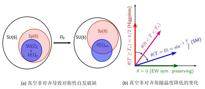 近日,我校物理学院张宏浩教授、蔡成丰博士及其合作者提出了一种基于真空非对齐的新的暗物质非热产生机制,这一机制可以适用于包括复合希格斯在内的一大类模型。真空非对齐是对称性自发破缺的一种方式,如图1(a)所示。我们以一个简化的复合希格斯模型为特例阐述了机制的运作方式。在高温时,电弱真空随手征对称性破缺而发生大的破缺,真空非对齐角在一段时间内维持在90度,即对应于一个无希格斯粒子(Higgsless)的真空。此时希格斯场会与模型中其它的赝南部-戈德斯通玻色子组合成一个质量复标量场,假定这个复标量可以携带一个新的U(1)对称性的非零荷,则它在这个真空中不会完全衰变为标准模型的粒子。如果模型中还有一些暗物质粒子也带有这个U(1)对称性的荷,那么希格斯场在这个真空中与暗物质受到相同对称性保护,同属于所谓的暗的部分。如果引入的新的U(1)对称性是电弱反常的,则在发生电弱相变时可通过sphaleron不对称地产生正反暗物质,之后正反暗物质会互相湮灭,直到反物质(或正物质)被全部湮灭,而最终残留的部分就可作为宇宙的暗物质遗迹。在我们的理论机制中,暗物质遗迹的不对称产生是在无希格斯真空下发生的,但随着温度的降低,真空非对齐角会开始变小并最终演化为今天的标准模型真空,真空非对齐角随温度的变化参见图1(b),而暗的U(1)对称性也随之发生自发破缺。在真空非对齐角开始偏离90度时,希格斯粒子开始从暗的部分中分离出来,也就是说希格斯粒子有可能在较高温度时曾经属于暗的一部分,但在温度降低后从暗的部分中演生出来,成为一个不稳定的实标量粒子。另一方面,还有一些复合暗物质粒子因为受到一个Z_2对称性的保护而不会完全衰变为标准模型粒子,它们虽然在无希格斯真空下是复标量场,但在标准模型真空下却会劈裂为两个有质量差别的实标量场,于是通过Z规范玻色子与原子核散射的过程被运动学禁戒,从而不会受到很强的直接探测限制。我们的理论机制预言,总会存在一个轻的赝标量粒子,这对暗物质直接探测如Xenon1T实验、宇宙学观测、超新星观测以及在对撞机实验中探测“Z规范玻色子衰变到光子及这个赝标量粒子”过程等结果都有深远的影响,从而可以得到检验。这项研究成果于2020年7月8日在线发表在Phys.Rev.Lett.125,021801(2020)上。