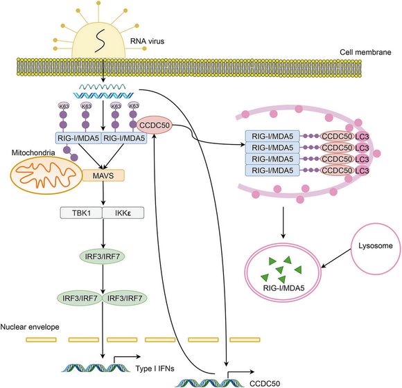 天然免疫是一种非特异性的宿主抵抗病原微生物入侵的免疫反应,它广泛存在于机体的绝大部分细胞,被认为是机体抵抗病原体感染的第一道防线。随着近几十年的研究,人们对天然免疫系统愈发了解,已经发现并鉴定出天然免疫反应的关键调控因子和信号转导因子,然而某些重要调控因子的结构和功能机制依然不清楚,且这些调控因子的生理和病理作用尚有待于研究。郭德银教授课题组利用CRISPR/Cas9第二代文库在免疫细胞中进行了全基因组水平的大规模无偏差筛选,发现了一系列参与天然免疫反应调控的新型基因。进一步的验证过程中发现CCDC50蛋白在RNA病毒感染下表达量显著增加且其表达模式和RLR的表达模式一致,提示着CCDC50可能参与调控RLR介导的信号通路活性。为了进一步验证该观察结果,该课题组构建了CCDC50条件缺失的小鼠模型,攻毒实验结果证明缺失CCDC50后,病毒感染条件下,I型干扰素表达上调,其下游的ISGs表达水平也随之升高,小鼠清除病毒能力增强,肺部组织损伤和炎性浸润减少,且小鼠存活率增加,从而证明CCDC50在机体水平具有生理学功能。