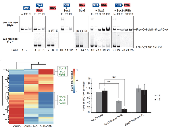 课题组研究人员通过PAR-CLIP和RNA SELEX确认了Sox2与RNA直接相互作用,进一步的测序分析发现Sox2偏好性结合一个CCCY核心基序和一个CGCG的二级基序。随后,研究人员利用EMSA和RNA免疫沉淀(RNA-immunoprecipitation assay)等手段确定了Sox2的RNA结合结构域(RBM),该结构域具有优先结合富含GC的RNA序列的特征。另外,通过RNA fishing实验和竞争性结合实验等的进一步分析,发现在DNA和RNA共同存在的情况下,Sox2使用其HMG结构域结合同源DNA序列,并同时利用RBM结构域在体外介导三元RNA/Sox2/DNA复合物的形成。除此之外,通过比较Oct4、Klf4、c-Myc (OKM)“鸡尾酒”以及不同Sox2突变体诱导下iPSC生成的效率发现,删除Sox2 的RBM结构域会影响iPSC的生成,并且显著地改变了体细胞重编程过程中的选择性剪接事件。