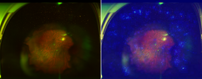 超广域眼底彩照人工智能眼病筛查系统:图中右侧高亮区域为筛选出来的病变